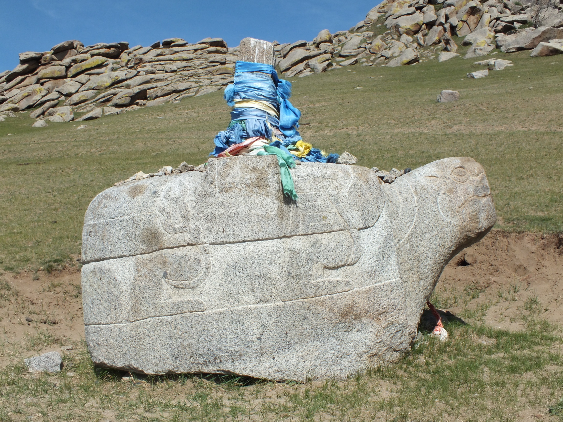 Another, more modern, stone turtle on the way to the lakes. The scarves are shamanistic offerings; blue is the most popular colour, and people also offer food and bottles of vodka.